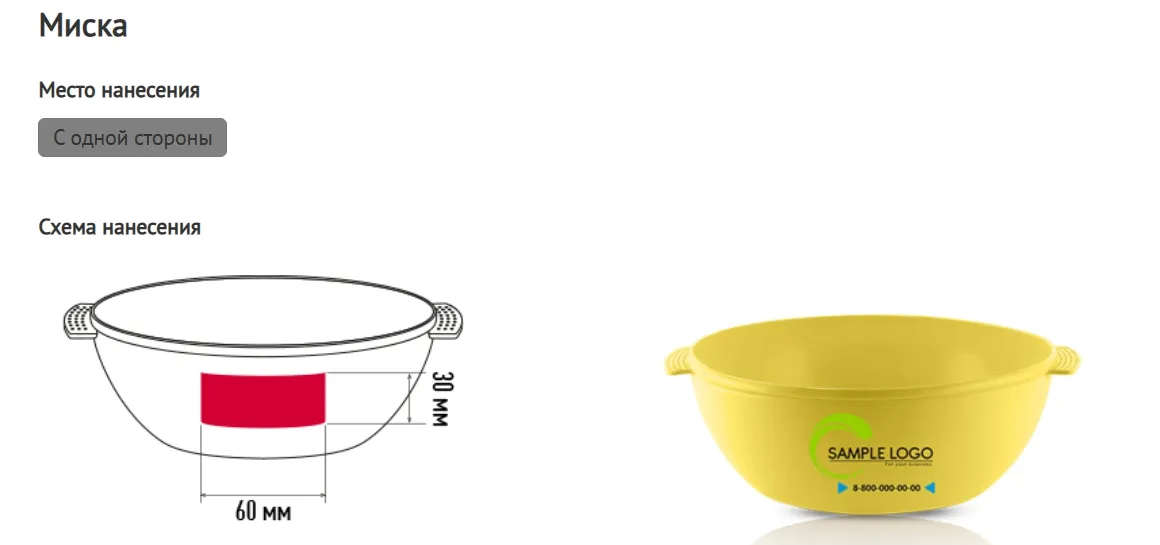 Кроме того, если на миску нанести логотип или другую рекламную информацию, изделие легко превратится в рекламно-сувенирную продукцию. Для этого во время оформления заявки на производство оптовой партии необходимо сообщить менеджеру, что требуется дополнительная услуга - по нанесению лого на миску.